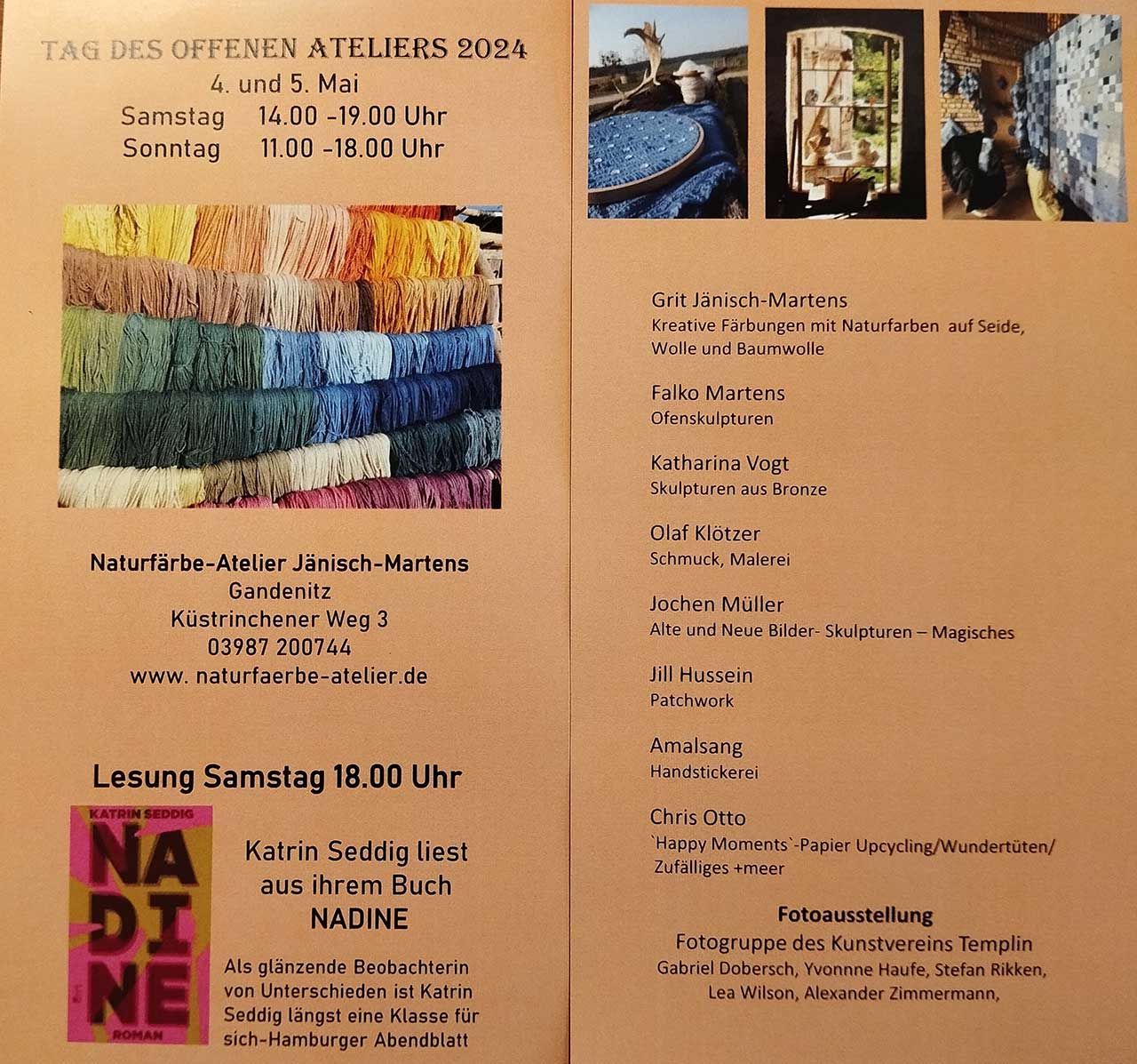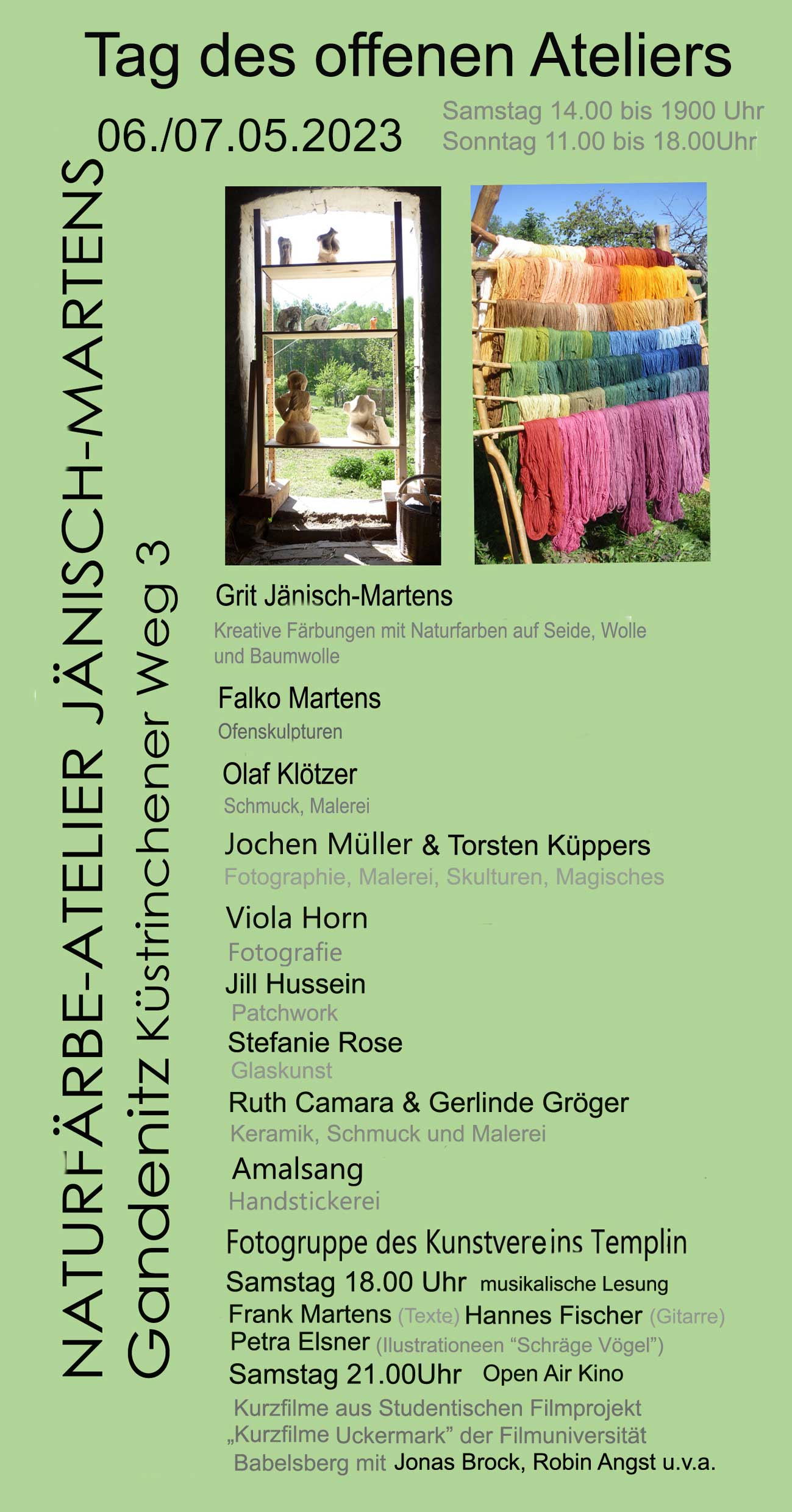 Seit 2007 lädt das Naturfärbe-Atelier zu den Tagen des offenen Ateliers am ersten Wochenende im Monat Mai ein. Dann verwandeln sich Scheune und Hof in eine große Ausstellungsfläche, auf der sich verschieden Künstlerinnen und Künstler mit ihren Werken präsentieren.